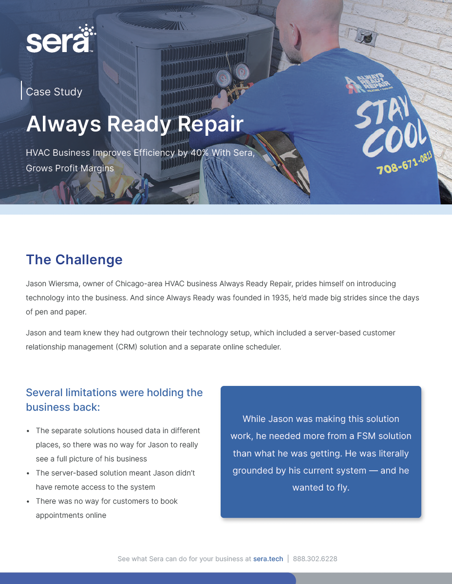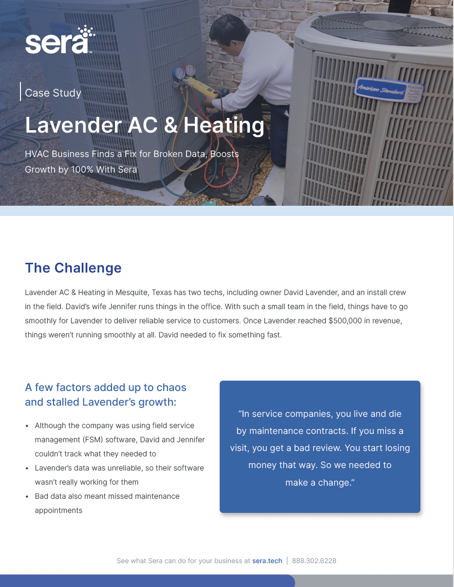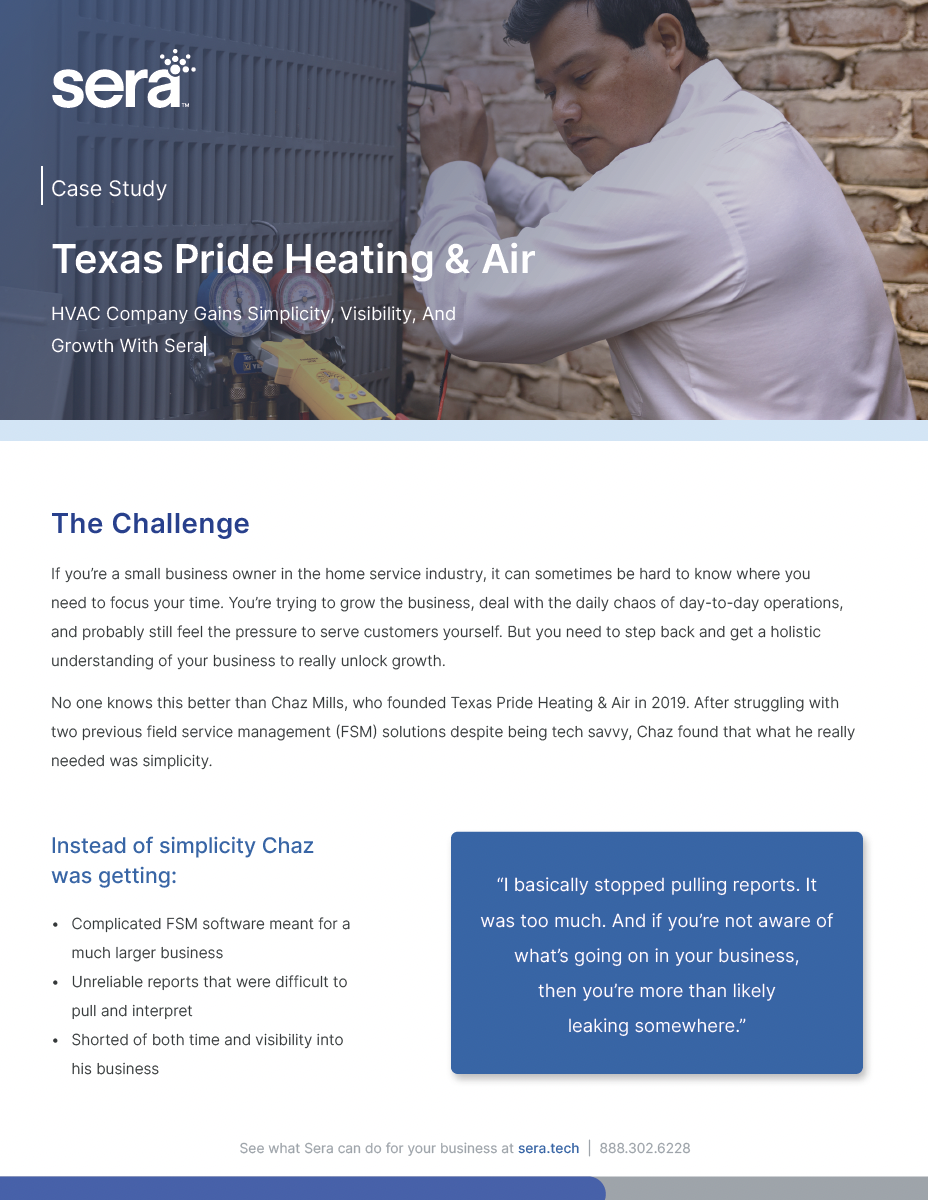Supercharge your HVAC, plumbing, and electrical business with Sera. Straight-up tools for straightforward growth—because your hard work deserves more profit.